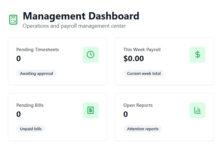 Employees log their daily work hours. The system calculates gross pay based on predefined rates, differentiating between employees and subcontractors. Admins can review and export payroll data anytime.