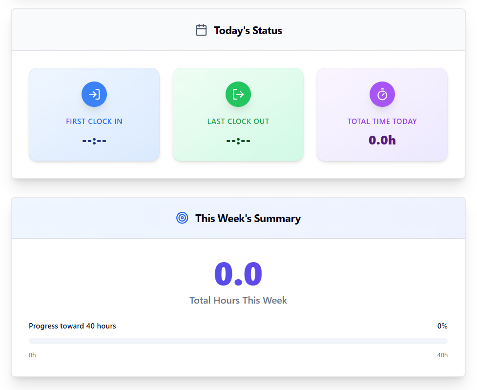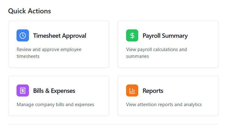 Users sign in through secure portals: 👉Employee Login 👉Admin/Manager Login. Each user sees only what’s relevant — from timesheets to project overviews.